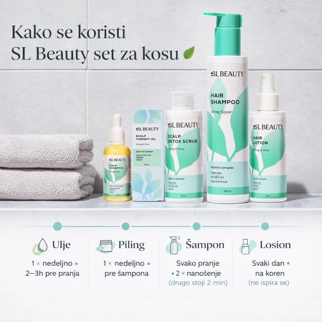 Svaki proizvod u SL Beauty setu ima svoju ulogu, ali tek zajedno rade punim kapacitetom. Piling i ulje pripremaju teme i uklanjaju prepreke, šampon nežno čisti bez narušavanja balansa, dok losion svakodnevno održava rezultate i podržava zdravo okruženje kože glave.