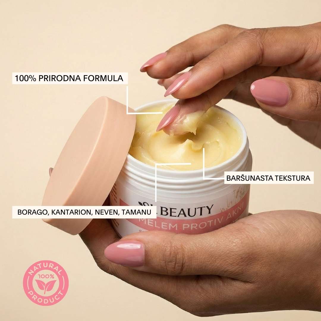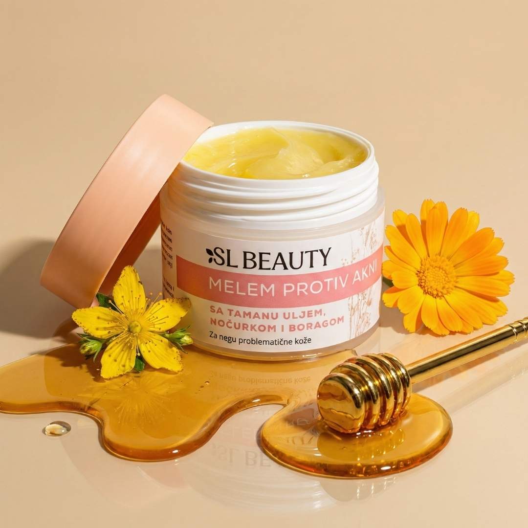 SL Beauty melem protiv akni je prirodna, ciljna nega za kožu sklonu nepravilnostima, upalnim bubuljicama i tragovima nakon akni. Formulisan sa tamanu uljem, noćurkom i boražinom, pomaže da se koža vidno umiri, ujednači i postane mekša, bez masnog i lepljivog osećaja. Idealan je kao svakodnevni “SOS” korak za lice i telo kada želiš čistiji i smireniji izgled kože