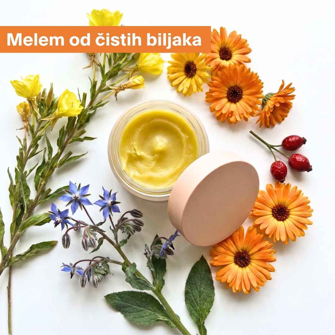 Melem deluje kroz kombinaciju hranljivih ulja + umirujućih biljnih ekstrakata: